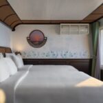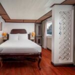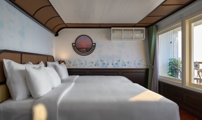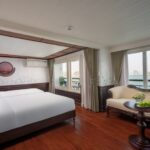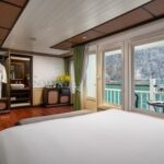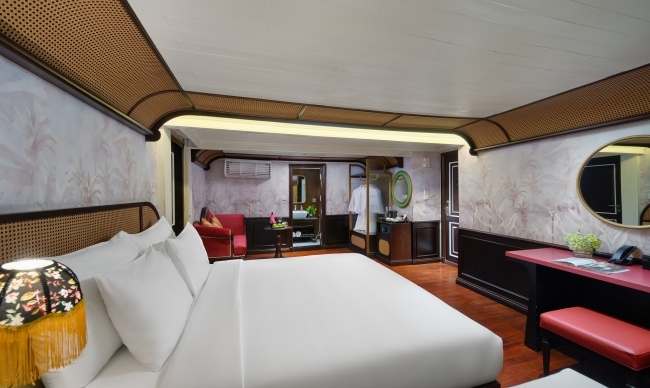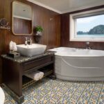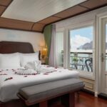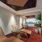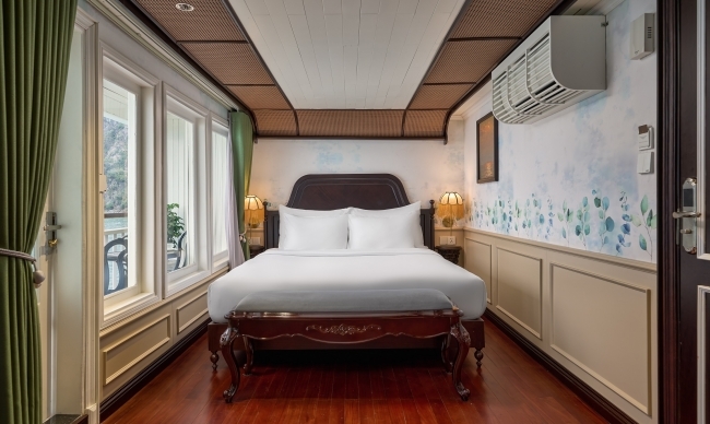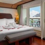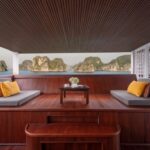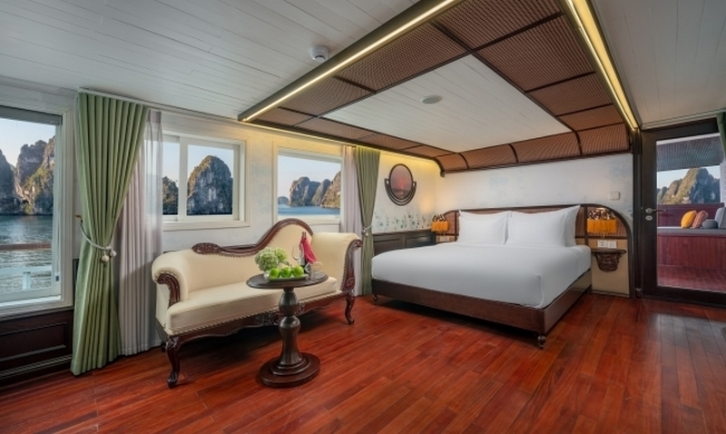 The boat anchors at the Cong Do area, a perfect spot for guests to go kayaking among majestic limestone mountains and enjoy swimming freely at pristine beaches. Guests can also relax on the endless stretches of white sandy shores, surrounded by breathtaking natural beauty.